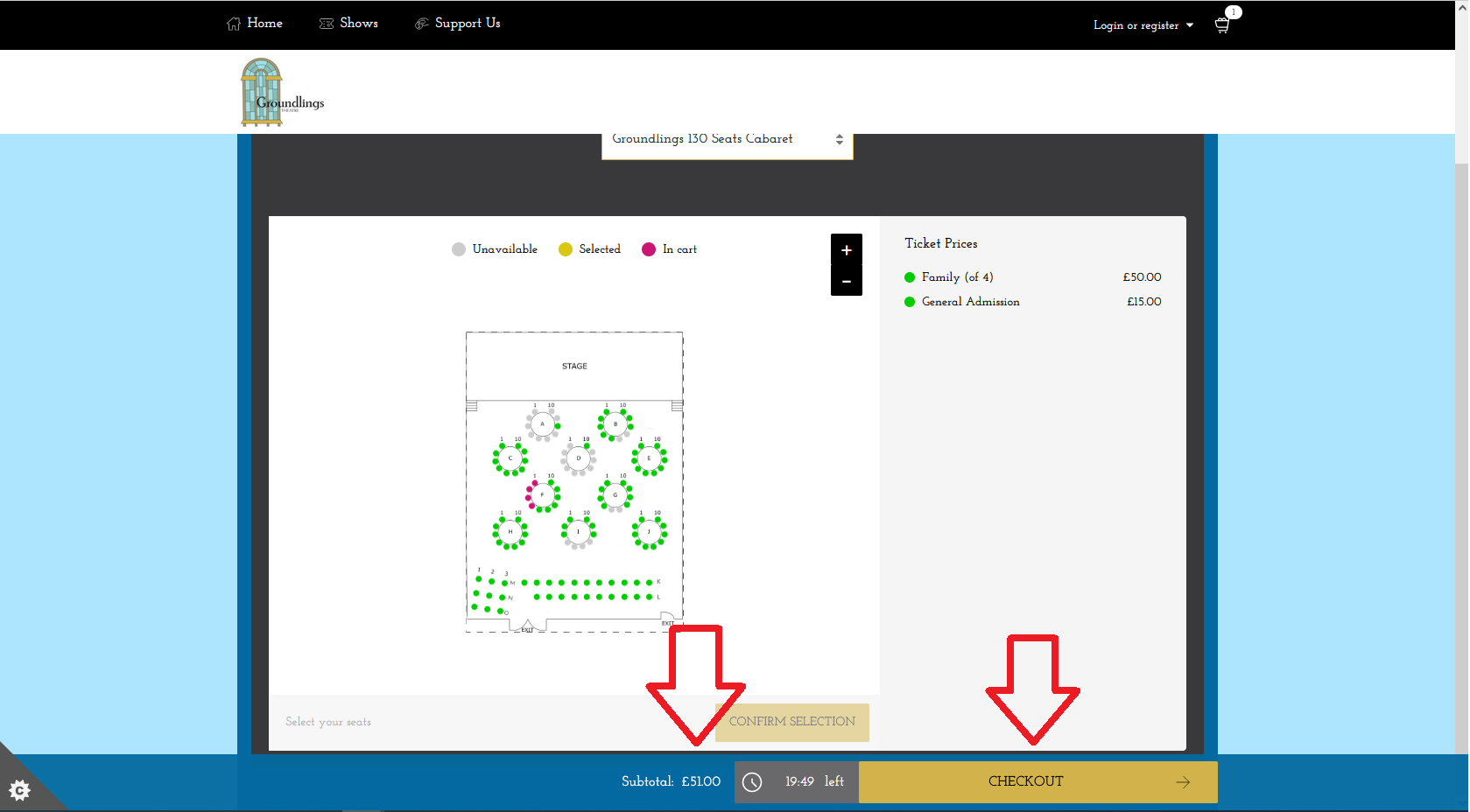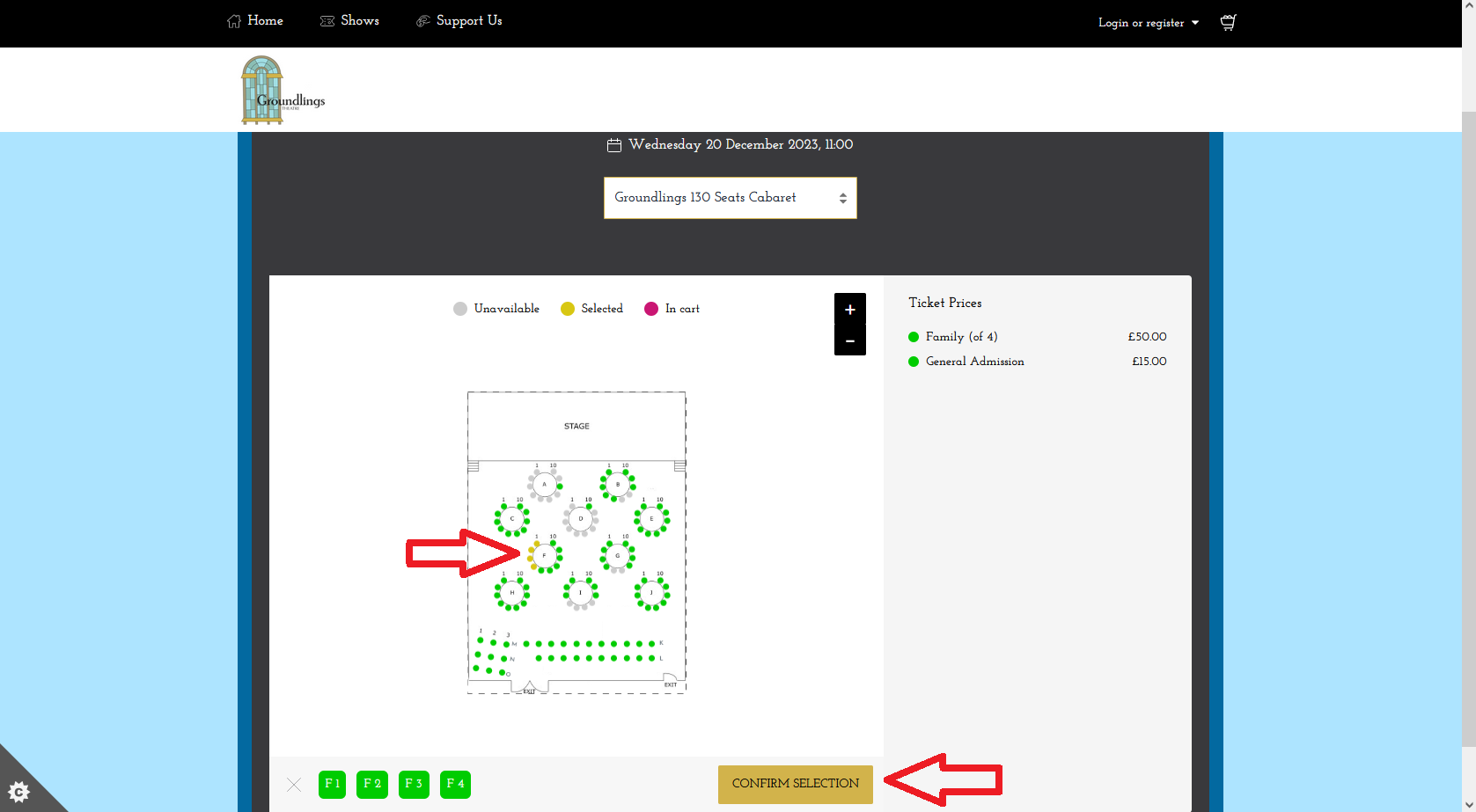 Highlight the seats which will turn Yellow. Once chosen the seats then click on Confirm Selection.